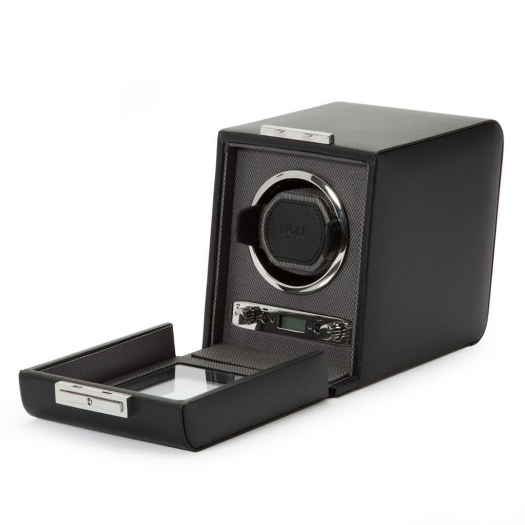 Wolf Winder. Cub Winder with cover in vegan leather with chrome finished hardware. Black color. SIZE: 5.25" L X 6" W X 5.75" H. FEATURES: Rotation: 10 second start delay, 900 TPD (Turns Per Day), patented rotation programs - Intermittent rotation with pause and sleep phases pre-programmed.Directional Settings: Bi-directional. Battery Option: Option to run the unit on AC power (universal adapter included) or AA batteries - alkaline or lithium (lithium batteries will last twice as long as alkaline batteries). Batteries not included. Model # 461103.