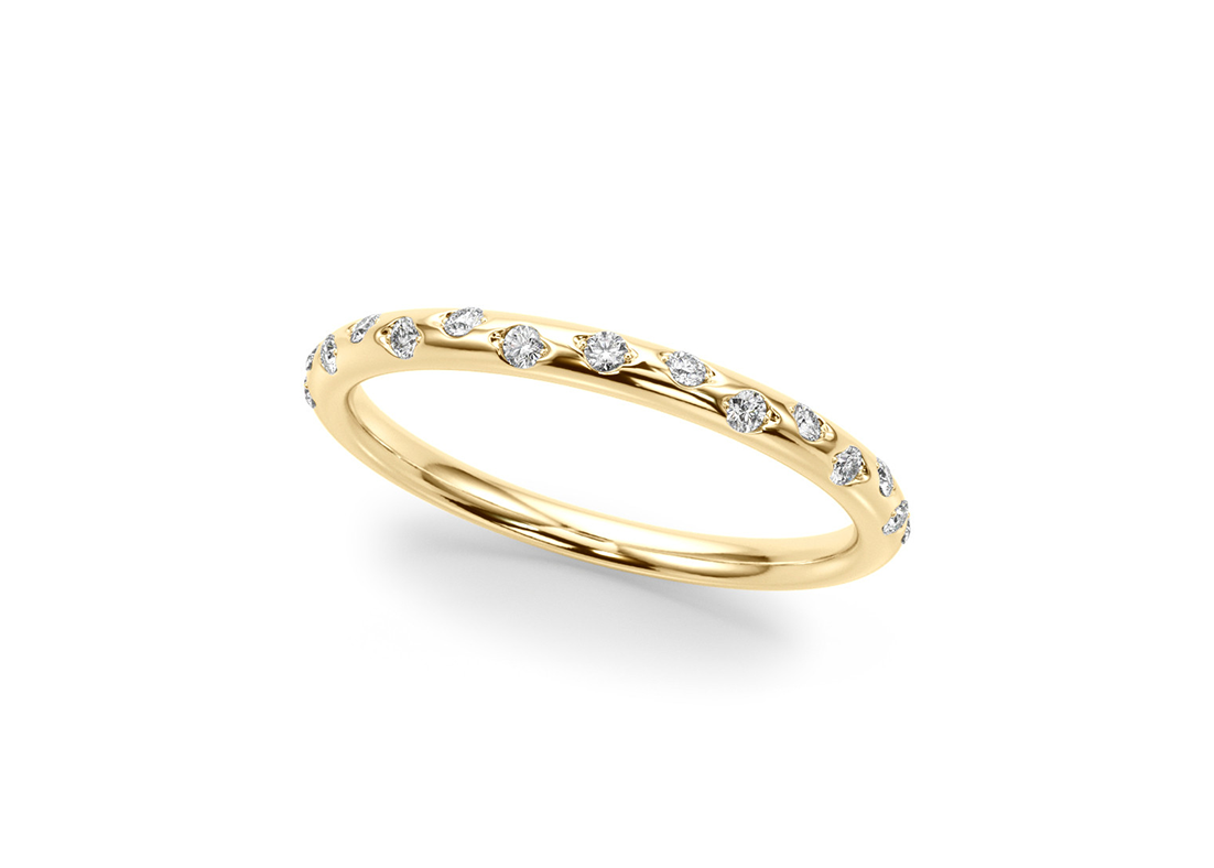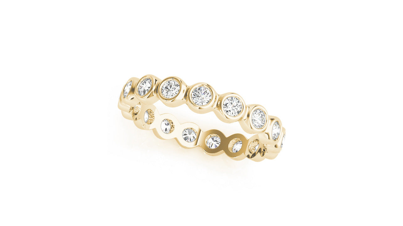 18 karat yellow gold bezel set round brilliant cut diamond wedding band.